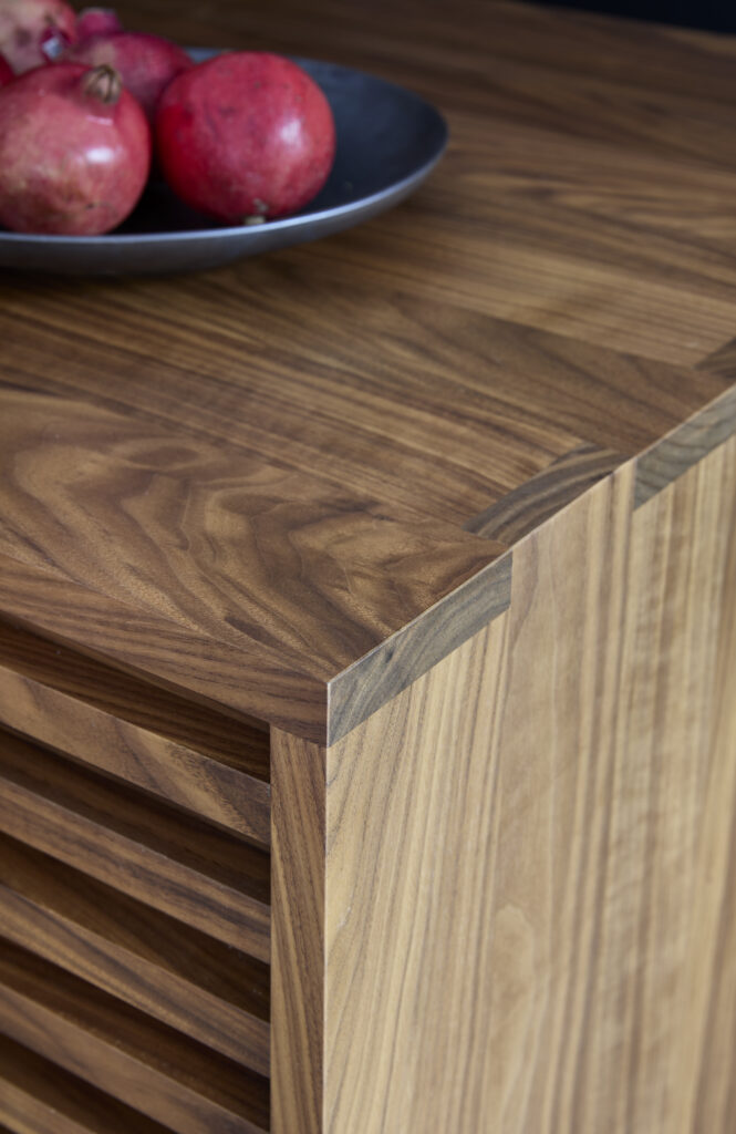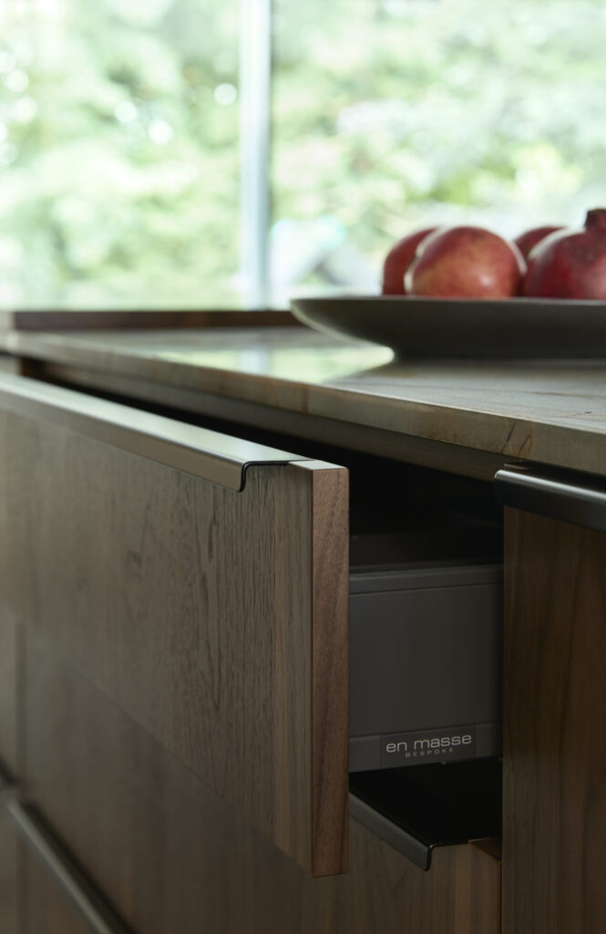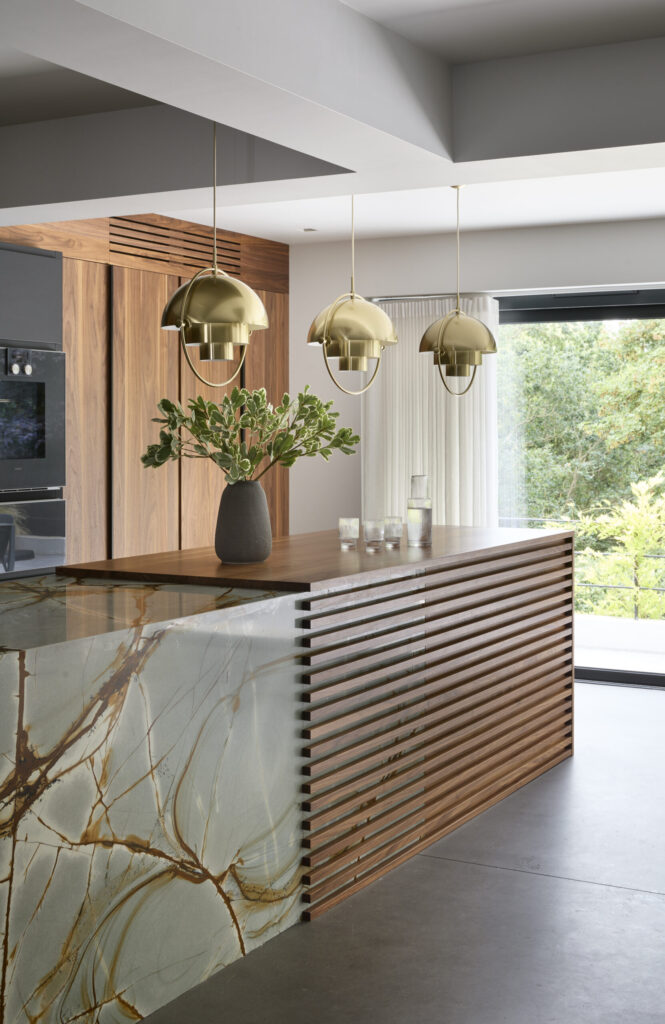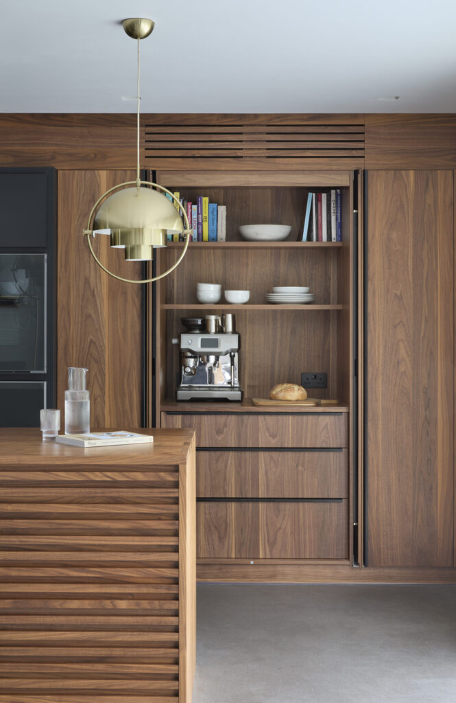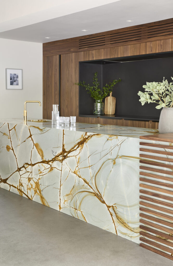 Offsetting the bold stone is a subtle infusion of warmth through horizontal slatted American black walnut at the island’s end. This detail blends seamlessly with the surrounding natural timber cabinetry, each panel hand-selected for tone and grain. Function meets form here, as this cabinetry cleverly conceals refrigeration, a tall pocket-door larder, and ample storage for this young family. All designed to be accessed with fluid ease while maintaining the kitchen’s clean but homely aesthetic.