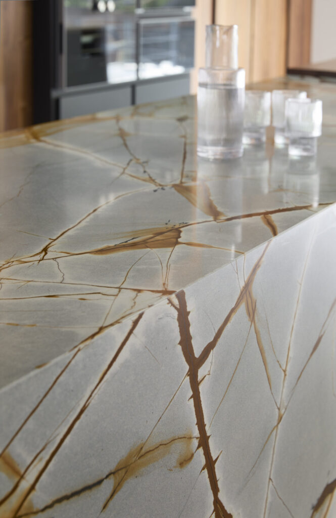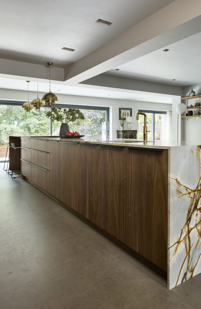At the heart of the design is a generously proportioned island which commands attention. Fully wrapped in the dramatic beauty of Blue Roma marble, with its rich blue, brown, and gold veining, the stone introduces both texture and tone, connecting the island visually to the surrounding light-filled interior. Its presence grounds the space, serving as both a work surface and a sculptural anchor.